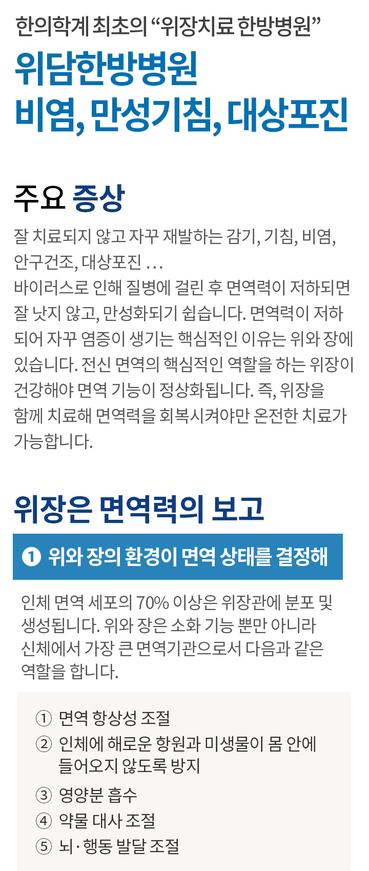 역할을 하는 위장이 건강해야 면역 기능이 정상화됩니다. 즉, 위장을 함께 치료해 면역력을 회복