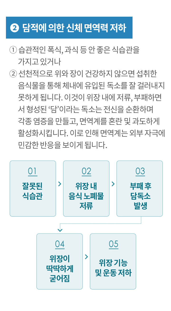 섭취한 음식물을 통해 체내에 유입된 독소를 잘 걸러내지 못하게 됩니다. 이것이 위장 내에 저류, 부패하면서 형성된 ‘담’이라는 독소는 전신을 순환하며 각종 염증을 만들고, 면역계를 혼란 및 과도하게 활성화시킵니다. 이로 인해 면역계는 외부 자극에 민감한 반응을 보이게 됩니다.